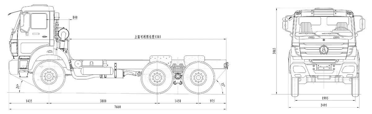 | Dimensions | Wheel Base (WB): 3800+1450mm Overall Length (OL): 8500mm Overall Width (OW): 2500mm Overall Height (OH): 3670mm Front Overhang (FOH): 1435mm Rear Overhang (ROH): 1600mm |