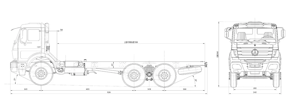 | Dimensions | Wheel Base (WB): 4450+1450mm Overall Length (OL): 9500mm Overall Width (OW): 2500mm Overall Height (OH): 3370mm Front Overhang (FOH): 1435mm Rear Overhang (ROH): 1900mm |