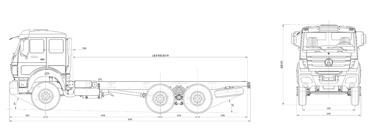 | Dimensions | Wheel Base (WB): 4450+1450mm Overall Length (OL): 9500mm Overall Width (OW): 2500mm Overall Height (OH): 3370mm Front Overhang (FOH): 1435mm Rear Overhang (ROH): 1900mm |