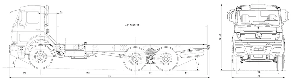| Dimensions | Wheel Base (WB): 4450+1450mm Overall Length (OL): 9500mm Overall Width (OW): 2500mm Overall Height (OH): 3670mm Front Overhang (FOH): 1435mm Rear Overhang (ROH): 1900mm |